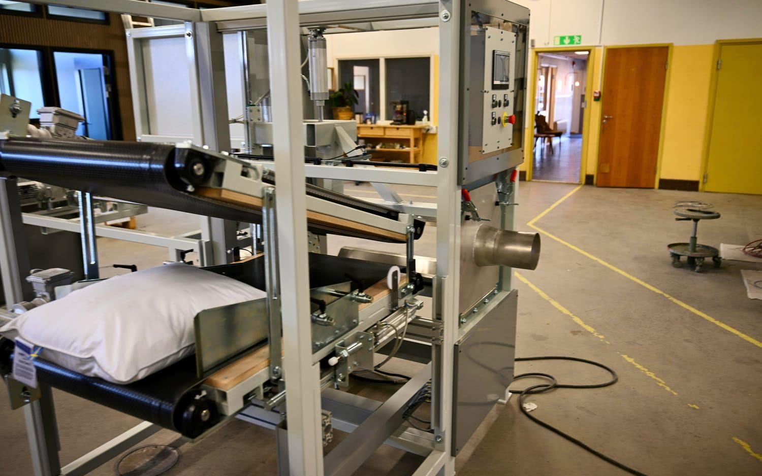 Det handlar i korthet om att packa upp balarna med fiber, bearbeta fibern så att den får rätt fluffighet, väga den och sedan spruta in den i tygfickan till det som ska bli en kudde. Sedan ska kanten sys igen, etiketterna ska fästas och sedan är det dags att rulla ihop och förpacka den färdiga kudden.